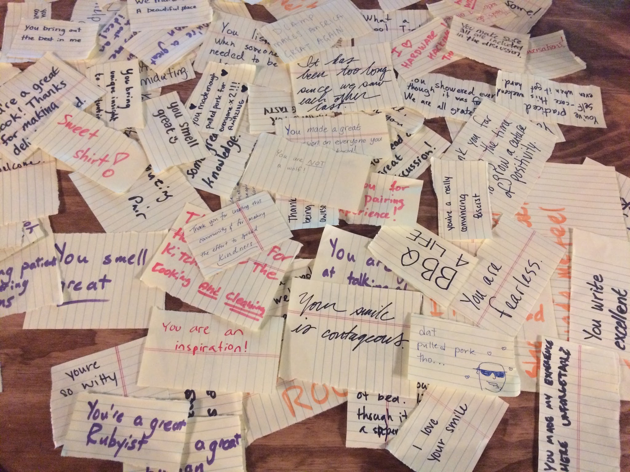 During the end of my retreat I was full of these mini epiphanies and felt mentally refreshed. I gained new experiences, interpersonal skills, and technical knowledge. Best of all, I made friends that were strangers merely a couple days before. People were tweeting about returning to real life as if they'd just left Burning Man. DCamp has left a beautiful memory in my heart and I hope every developer gets the opportunity to experience it at least once.