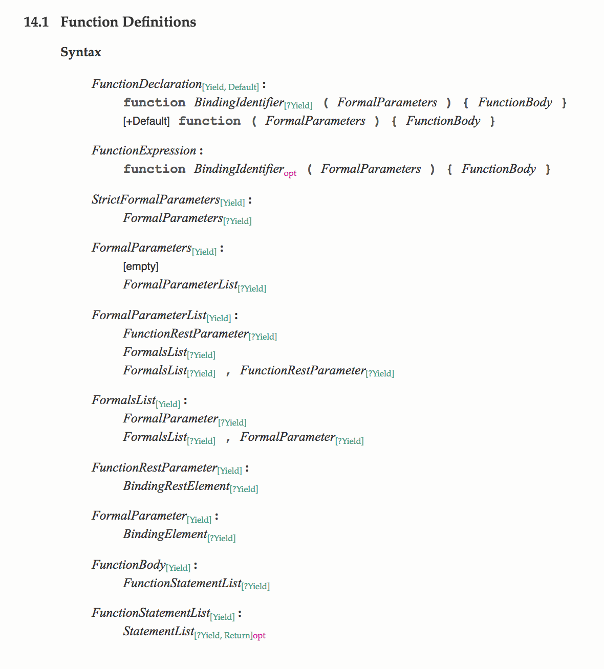 That bears repeating. In JavaScript, the syntax is implemented by the JavaScript parser and interpreter. More than likely that means baked in with some C or C++ code somewhere. Beyond the implementation, it means that there needs to be a specification for the syntax as part ECMA standard so that any of the multiple engines can be sure to get it right.